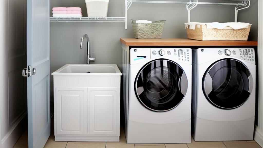 Install sturdy shelves on the walls with open design above your washer and dryer. This provides ample storage space for laundry essentials such as detergent, fabric softener, and stain removers. You can also use decorative baskets or bins to keep smaller items organized.