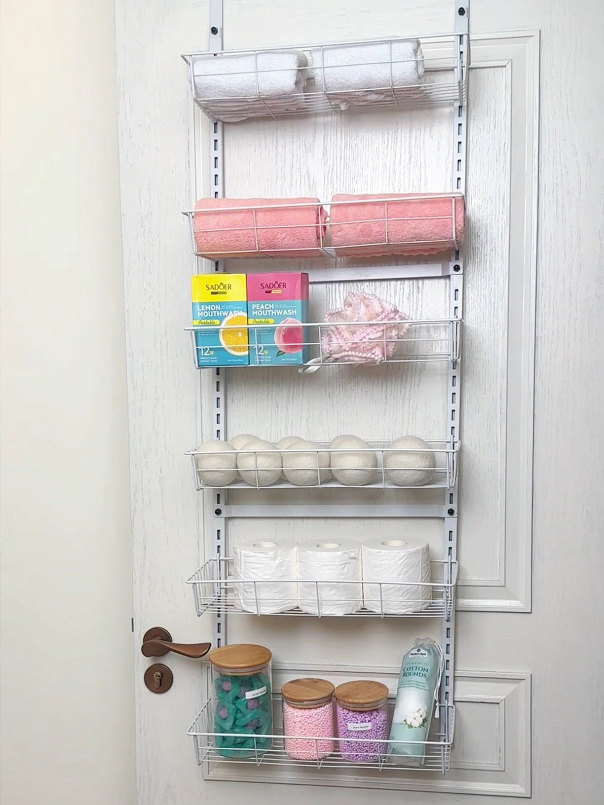 This 6-Tier Over-the-Door Pantry Organizer is a game-changer! Super easy to install, sturdy construction, and maximizes space like a boss. I've got my laundry pods, towels, mouthwash, and more neatly organized. Quick delivery, A+ purchase!